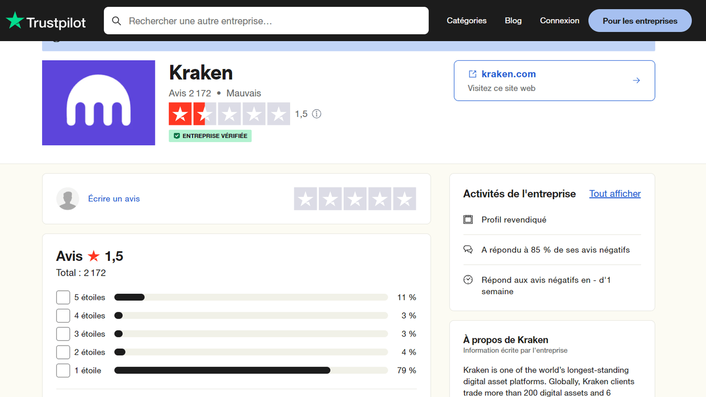 Malgré ces atouts, Kraken reçoit de nombreuses critiques négatives, avec une note moyenne de seulement 1,5 étoiles sur 5 pour plus de 2 100 avis. Les utilisateurs se plaignent souvent de la qualité du service client, notant des délais de réponse longs et une assistance insuffisante pour résoudre les problèmes techniques. De plus, certains trouvent que la plateforme manque de services supplémentaires pour optimiser la gestion de leur portefeuille.