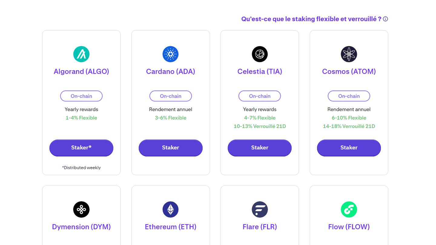 Kraken propose le staking pour plus de 20 cryptomonnaies, ainsi que pour les euros et dollars. Les récompenses varient de 1% à plus de 24%, mais les cryptomonnaies les plus populaires comme Bitcoin et Ethereum offrent des rendements très faibles, souvent inférieurs à 1%. Quant à eux, les altcoins moins connus offrent des rendements plus élevés, mais ils sont aussi plus volatils.