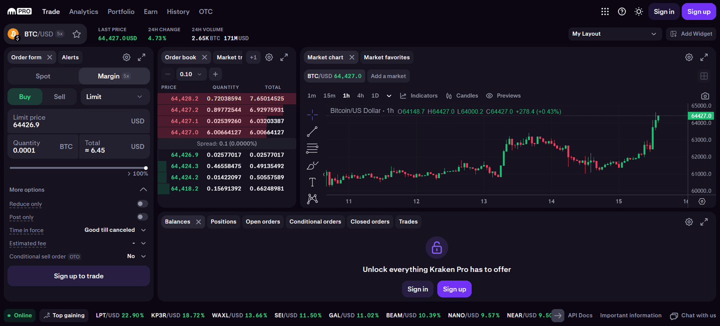 Kraken Pro est conçu pour les traders expérimentés, offrant une interface de trading avancée et des outils d'analyse technique. Cette plateforme permet d'accéder directement aux marchés avec des frais de transaction réduits pour les gros volumes.