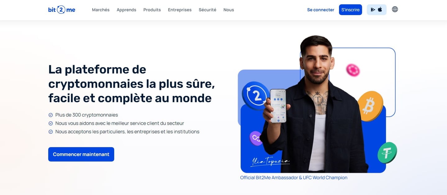 Bit2Me est une plateforme leader en Europe axée sur l'opérativité et l'offre de divers services de cryptomonnaies ; elle est connue pour sa grande variété de services offerts au-delà de la simple achat et vente de cryptomonnaies (où vous pourrez négocier plus de 350 crypto-actifs), ainsi que pour sa facilité d'utilisation, et son strict respect et rigueur en matière de sécurité et protection de ses investisseurs.