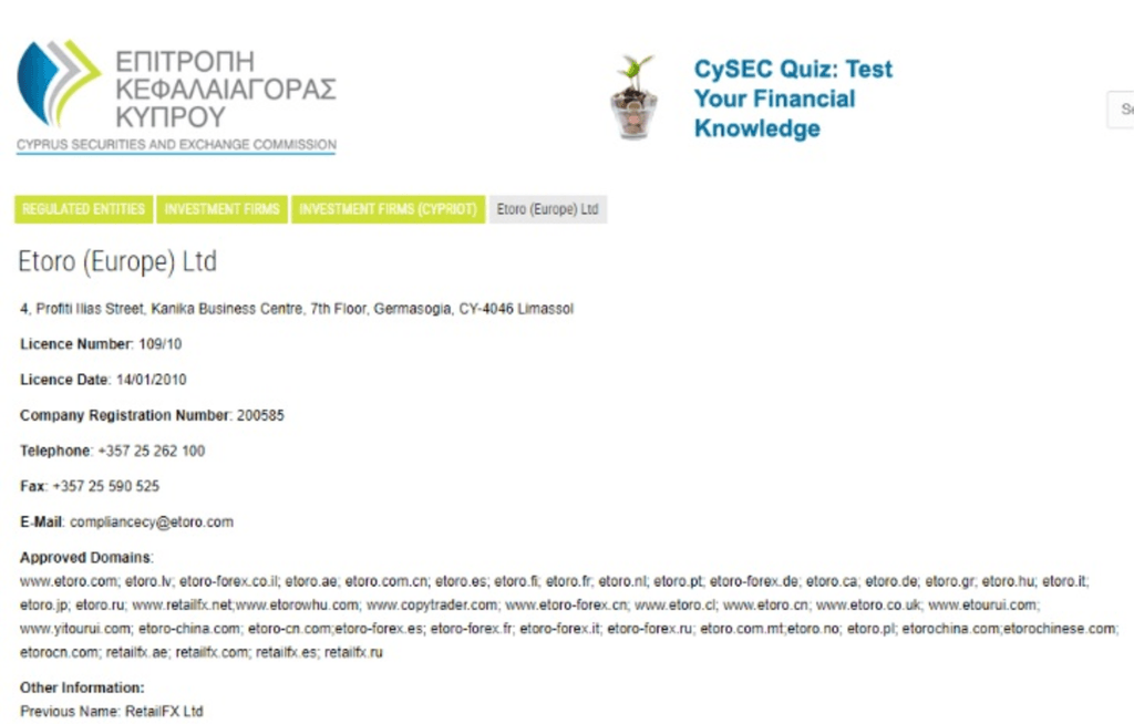 Toutefois, pour les comptes européens (y compris en France), eToro opère sous licence de la CySEC (Chypre), avec un numéro d'enregistrement officiel. Dans ce cadre :