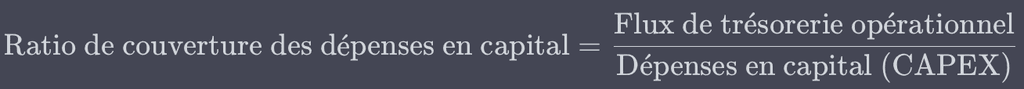 Ce ratio détermine dans quelle mesure l'entreprise peut financer ses achats d'équipements, de machines, de véhicules, etc., à partir de son flux de trésorerie opérationnel. Pour le calculer, on utilise :