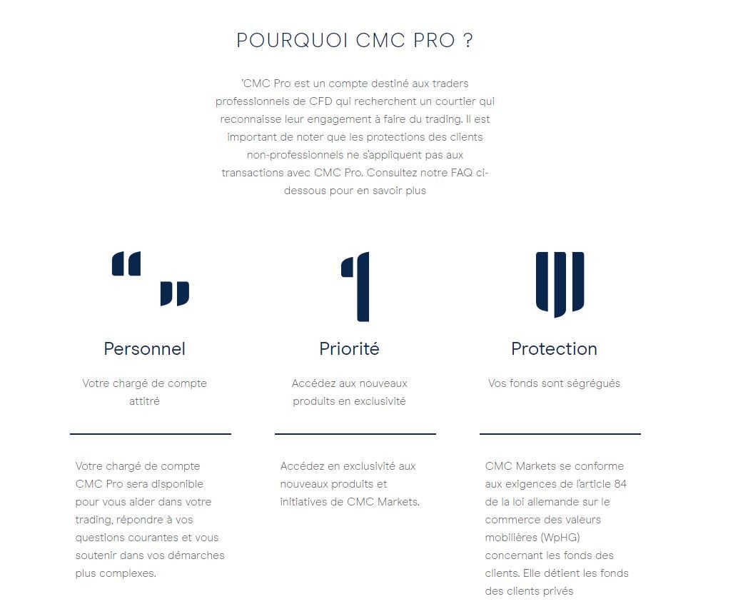 En somme, le CMC Pro est conçu pour les traders qui recherchent un service plus avancé et engagé. Cependant, il est important de noter que les protections accordées aux clients de détail ne s'appliquent pas au compte CMC Pro.