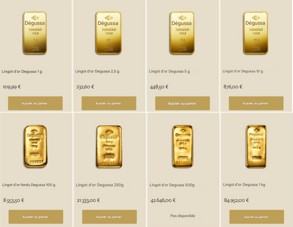 Distributeurs en ligne | Exemple avec DEGUSSA lingots d'or