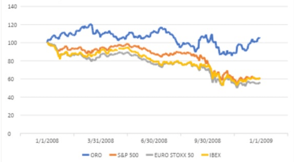 Historiquement, l'or a démontré un meilleur comportement que les marchés boursiers mondiaux en périodes de forte volatilité ou d'aversion au risque, comme cela a pu être le cas lors de la crise financière de 2008. Durant cette période, au cours de laquelle certaines des principales bourses mondiales ont subi des baisses d'environ -40%, l'or a connu une revalorisation de +5%. Il semble donc approprié, du moins du point de vue de la couverture et de la diversification, d'avoir une partie structurelle du portefeuille investie en or.