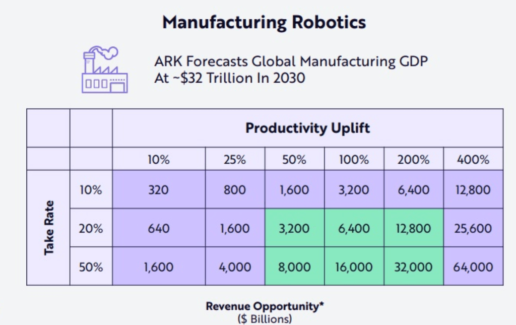 Selon les estimations d'ARK Invest, l'adoption de robots permettra au PIB manufacturier mondial d'atteindre 32 000 milliards de dollars en 2030, stimulé par des augmentations de productivité allant jusqu'à 400 % dans certains cas.
