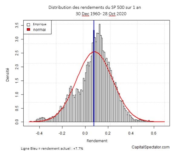 Le graphique suivant montre la répartition des rendements du S&P500 pour des plages annuelles. Ces données sont très utiles pour 3 différentes raisons :