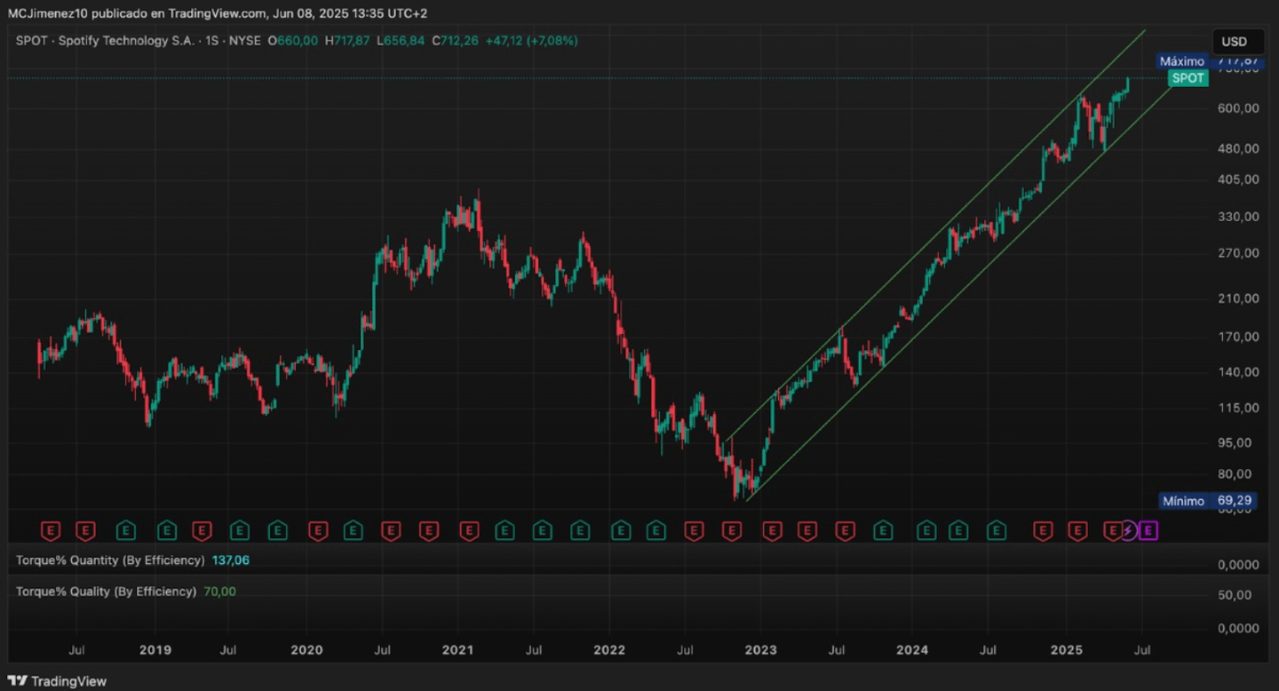 En ce qui concerne son action de prix, SPOT se trouve à des sommets historiques après une grande tendance haussière commencée fin 2022, formant un canal ascendant parfait assez étroit, il n'est donc pas exclu d'attendre de nouveaux rapprochements vers la partie inférieure du canal pour rechercher des opportunités d'achat.