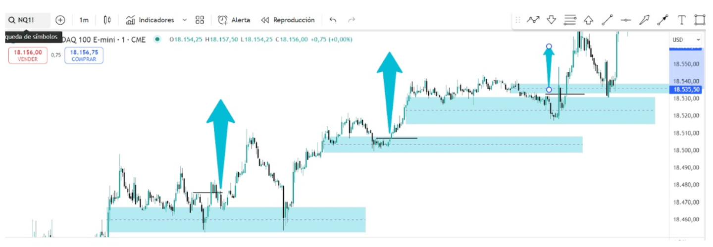 Dans le cas des FVG authentiques qui se dirigent vers une liquidité, le processus est le même, réduire la temporalité et rechercher les changements de structure. Dans l'image suivante, vous pouvez voir cela en descendant à un TF d'une minute. Dans le premier cas, nous aurions peut-être déclenché le Stop, dans les deux autres cas, non. L'objectif sera toujours une zone de liquidité