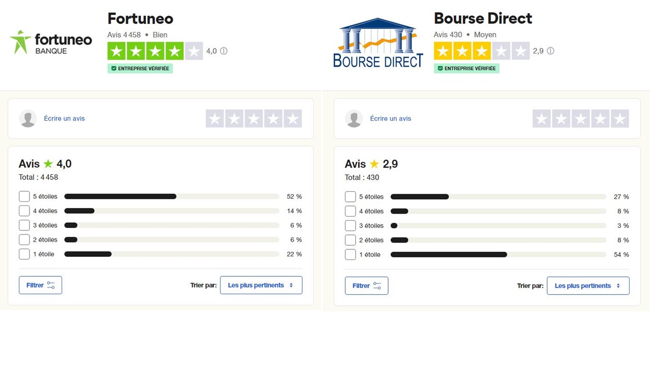 Si nous considérons les évaluations effectuées sur Trustpilot, Fortuneo obtient une note beaucoup plus élevée soit 4 étoiles contre 2,9 étoiles pour Bourse Direct.