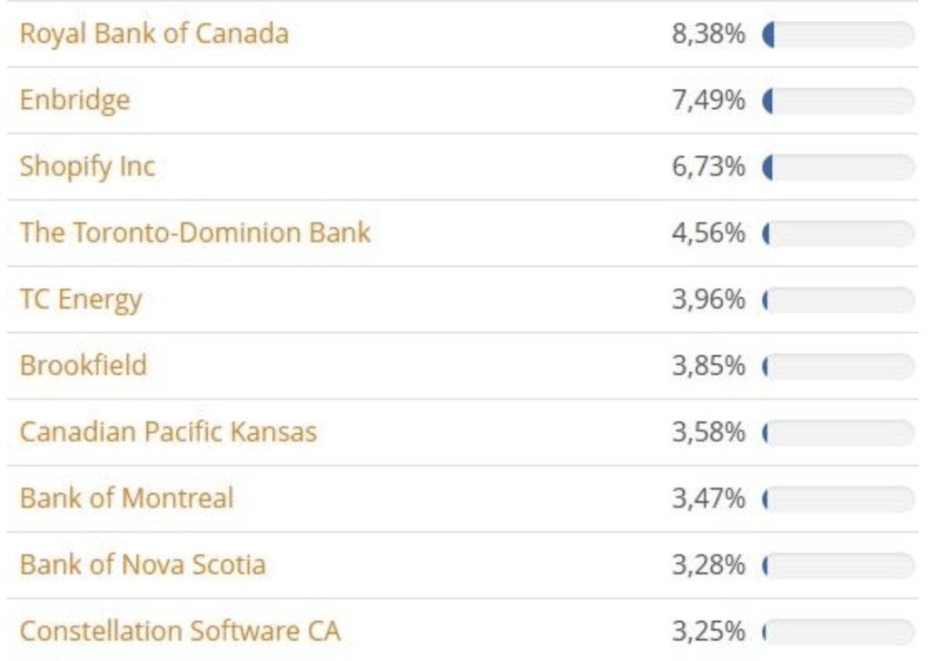 Certaines des entreprises incluses dans l'indice sont Royal Bank of Canada, Bank of Montreal, Toronto-Dominion Bank, Suncor Energy, Enbridge, Manulife Financial et Bank of Nova Scotia, entre autres.