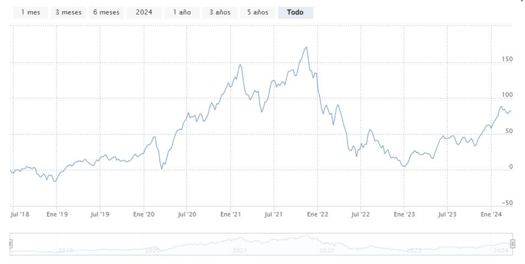 Pour toutes ces raisons, NVIDIA est devenue l'entreprise avec la plus grande capitalisation boursière au monde, surpassant les géants Microsoft et Apple, qui se disputaient ce poste depuis plusieurs années. Et, en conséquence, la réévaluation du prix de ses actions a été stratosphérique, comme peu d'entreprises l'ont réalisé au cours de l'histoire, réalisant ses plus grandes réévaluations à l'époque la plus récente.