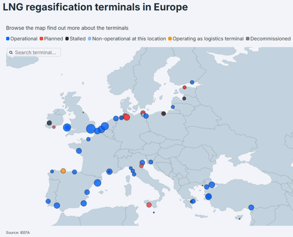 Comme on peut le voir sur l'image ci-dessus, seuls les points bleu foncé sont des usines en fonctionnement , dont beaucoup sont situées en Espagne - qui n'est pas en vain le deuxième plus grand importateur de GNL, dépassé par la France - le reste sont en projets d'expansion, en construction ou simplement planifiés.