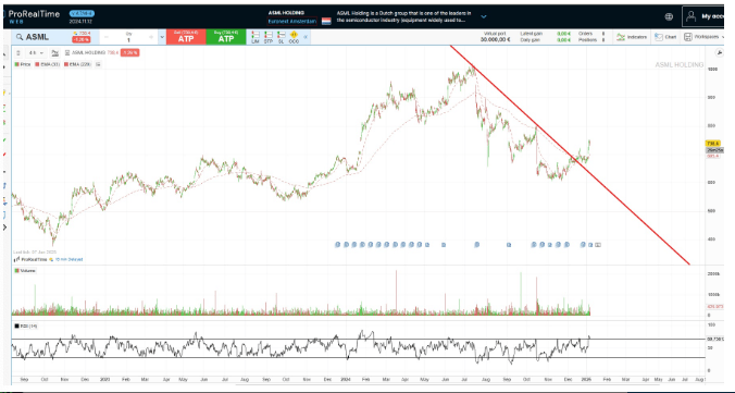 Je sais que ce n'est pas la première fois que nous en parlons, mais peu d'entreprises sont aussi critiques pour le secteur technologique mondial que la néerlandaise ASML Holding. Elle est pratiquement le seul fournisseur mondial de machines de lithographie ultraviolette extrême (EUV) qui permettent de fabriquer les puces les plus avancées du monde. Pour te donner une idée, sans ASML, la miniaturisation et la puissance croissante des semi-conducteurs seraient impossibles. En 2024, ASML a réduit ses prévisions, ce qui a eu un impact négatif sur sa cotation, mais ce qui est intéressant, c'est que rien n'a changé dans sa position dominante.