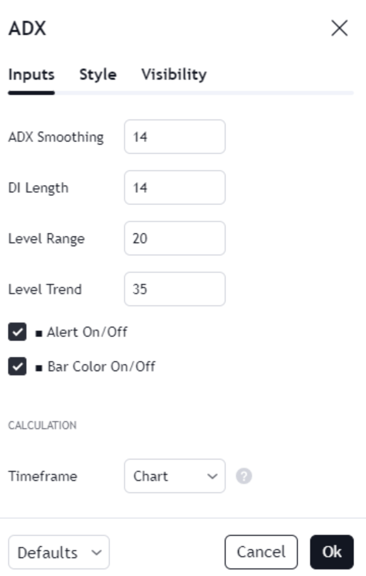 Comme pour la plupart des indicateurs Welles Wilder, l'ADX est disponible sur la plupart des plateformes graphiques. Dans TradingView, il est appelé « Indice directionnel moyen ».Avec cette version de base, vous n'aurez accès qu'à la ligne ADX principale et pourrez configurer deux paramètres :