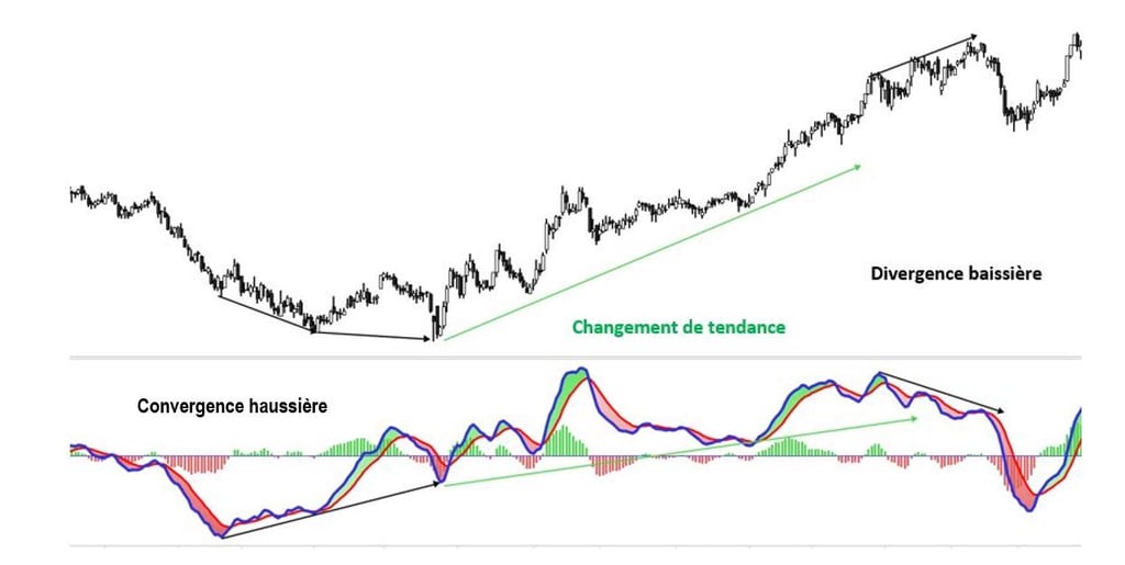 Dans l'étude des divergences, il faut observer si les tournants du MACD correspondent aux extrêmes successifs du graphique des prix. Il existe des convergences et des divergences haussières et baissières, comme nous pouvons le voir sur le graphique ci-dessous: