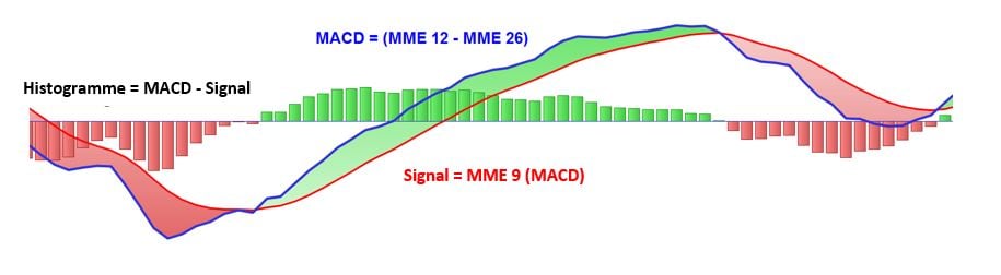 Le MACD est un indicateur de tendance qui utilise des moyennes mobiles. Il est capable de réduire une partie du retard dû à l'utilisation de moyennes mobiles. Le MACD est la différence entre deux moyennes mobiles exponentielles de différentes périodes. Les moyennes les plus utilisées sont celles de 12 et 26 périodes.