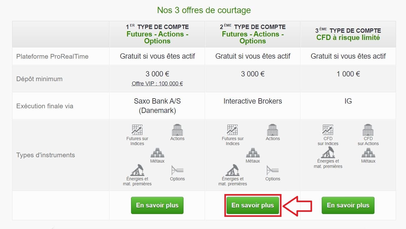 Ensuite, dans la colonne où figurent les courtiers partenaires de ProRealTime (avec Interactive Brokers), cliquez plus bas sur "En savoir plus".