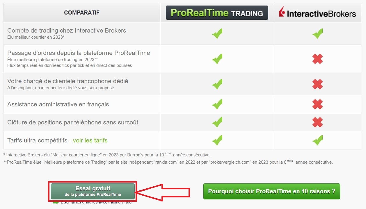 Vous atterrissez ensuite sur une nouvelle page, où vous devez cliquer sur "ESSAI GRATUIT de la plateforme ProRealTime".