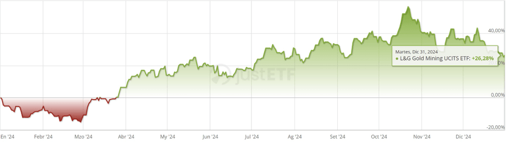 D'autres ETFs liés à l'or intéressants sont ceux qui suivent les mines d'or. Ils sont plus cycliques et volatils que ceux de l'or, mais peuvent être utiles dans certaines stratégies de rotation et de spéculation. Voici ceux qui ont eu la meilleure performance au cours de l'année dernière 2024 :