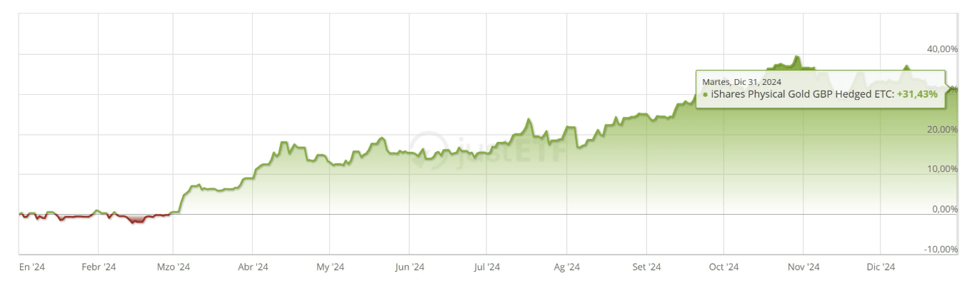Dans cet article, nous allons découvrir comment investir dans l'or via des ETFs. Et c'est que dans l'année récemment terminée 2024, le métal précieux par excellence a réussi une revalorisation de plus de 30%, même légèrement supérieure à celle du S&P500. Par conséquent, il est intéressant de voir quels sont les meilleurs ETFs d'or.
