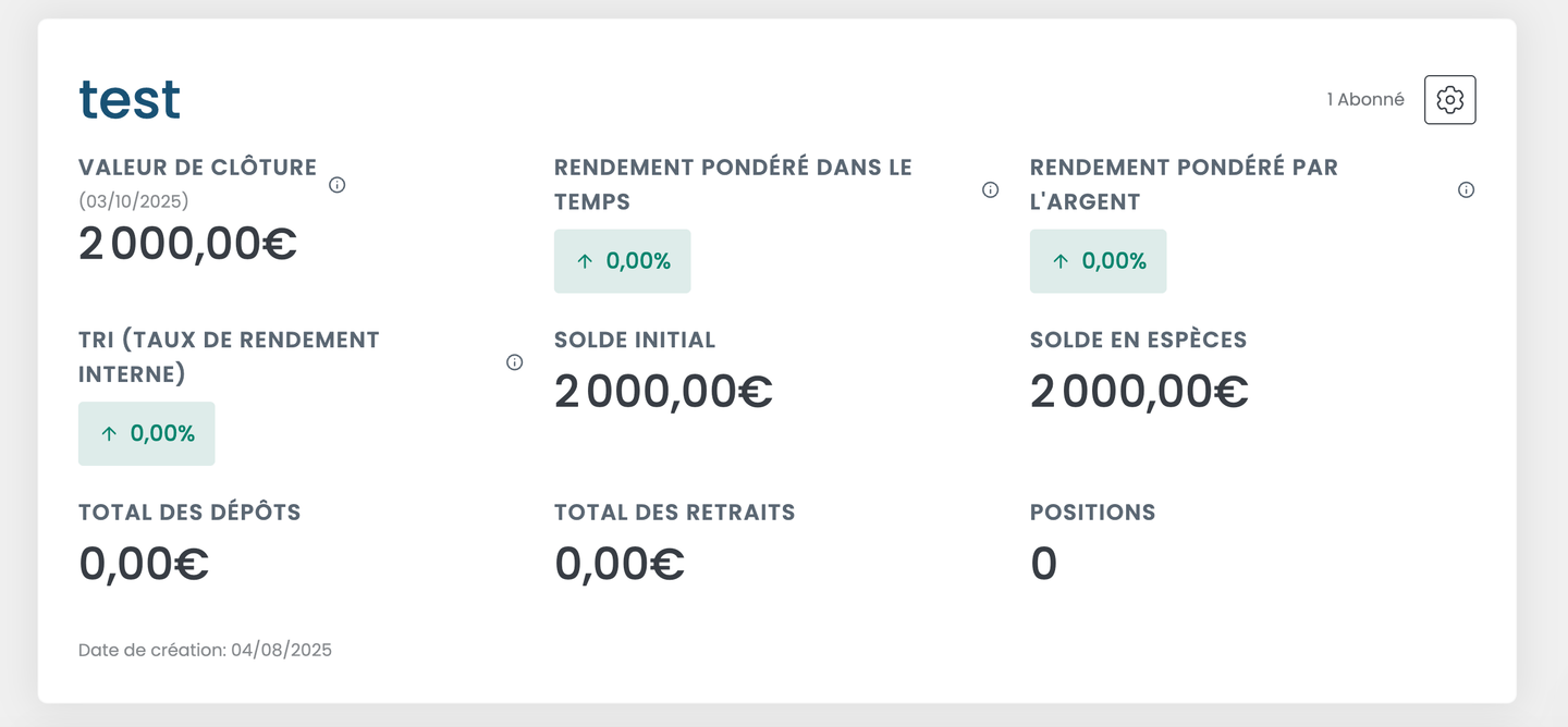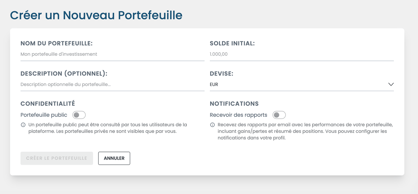 Vous pouvez y renseigner les paramètres de base de votre portefeuille : nom, description, etc. L'un des champs les plus importants est le solde initial. Si vous pensez à l'ouverture d'un compte chez un courtier, il correspond à l'équivalent du montant initial. Ce solde initial servira à effectuer vos premières transactions d'achat d'actifs, mais vous pourrez toujours effectuer des dépôts supplémentaires ultérieurement.