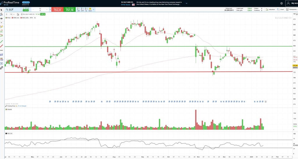 En tout cas, si les résultats projetés pour 2024 se confirment, techniquement, nous pourrions envisager une première entrée au support de 730 USD ou près de cette zone (ligne rouge), où une fois touchée, elle semblait rebondir avec une entrée de volume de négociation. D'autre part, on pourrait également envisager une deuxième entrée une fois qu'elle aurait franchi avec force (attention au RSI). la résistance des 850 USD par action (ligne verte).