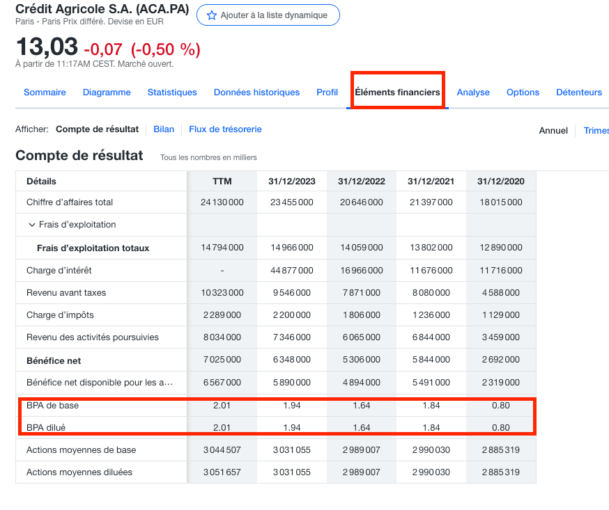Nous allons voir de manière simple comment calculer le ratio P/E d'une entreprise à travers un exemple simple comme le Crédit Agrocpñe avec l'aide d'une plateforme de données simple et accessible à tout investisseur : Yahoo Finance.