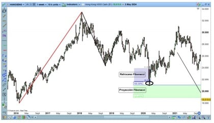 Et à l'inverse, dans le cas de la recherche d'un retracement de Fibonacci d'une impulsion haussière, ce que nous ferons est de prendre l'outil de retracement de Fibonacci et de placer le premier point dans la zone basse de l'impulsion, et le deuxième point dans la partie la plus haute de l'impulsion. Les différentes cotes de pourcentage de correction seront automatiquement dessinées.