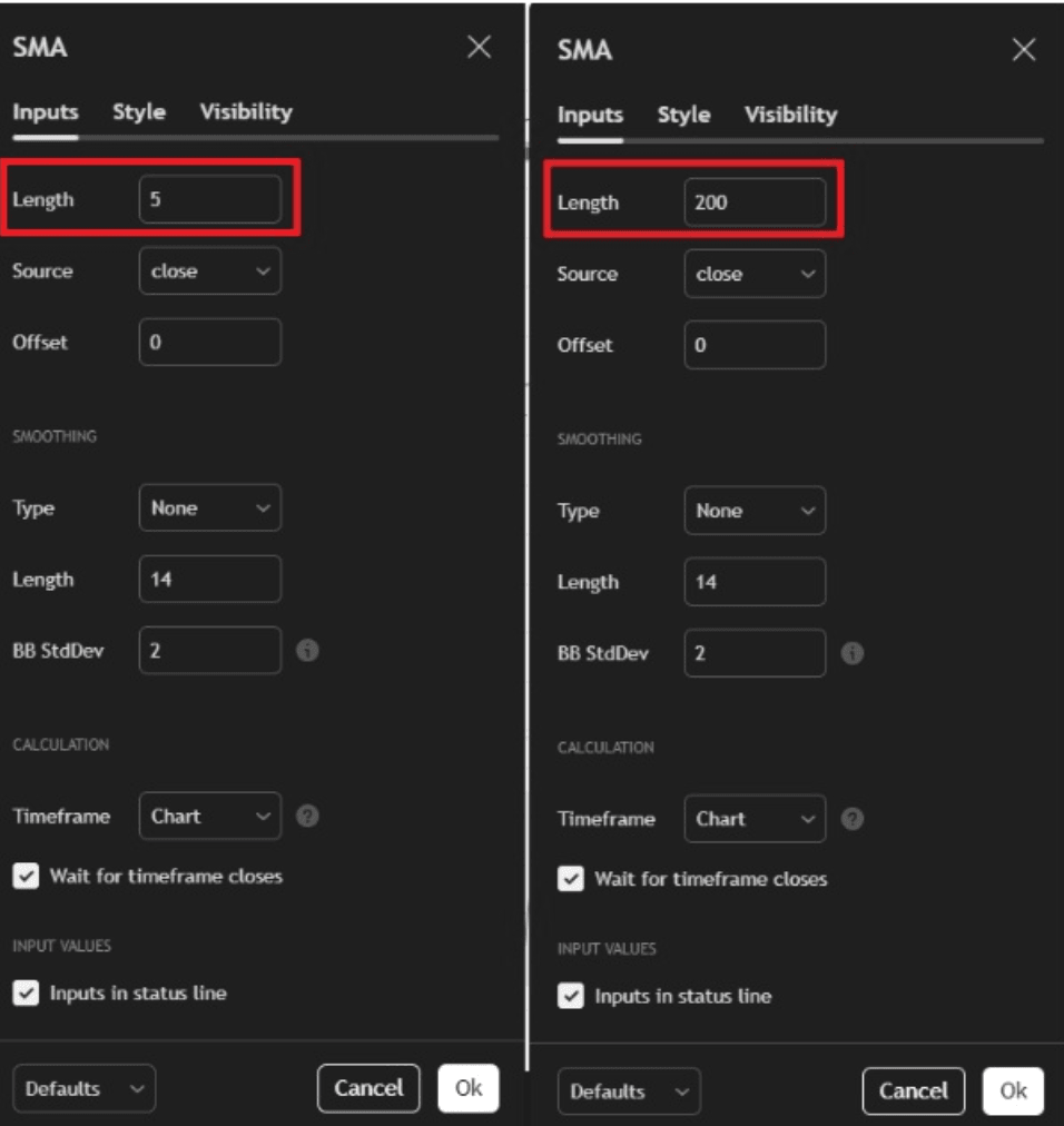 Ensuite, nous recherchons l'indicateur Moving Average Simple et l'insérons deux fois. Ensuite, nous configurons leurs périodes pour avoir deux moyennes de 5 et 200 périodes.