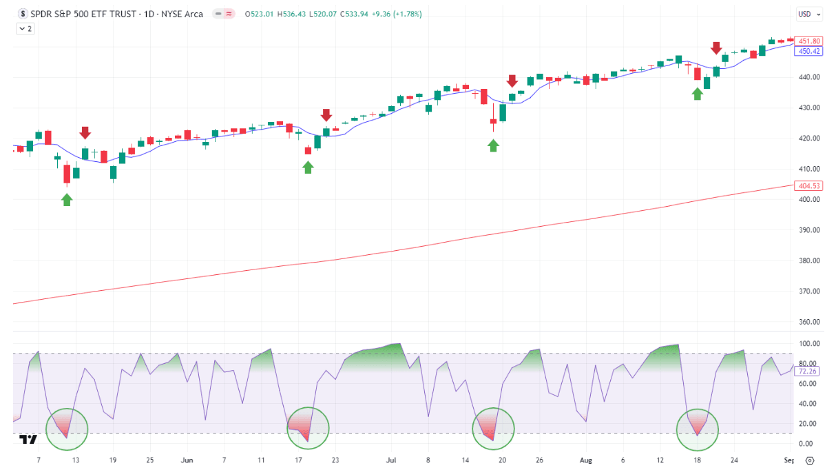 Pour cela, nous utiliserons le SPY, c'est-à-dire l'ETF qui réplique le comportement de l'indice S&P500. En particulier, nous pouvons voir sur le graphique suivant quatre signaux d'achat qui se sont produits en 2021, lorsque le RSI2 a clôturé en dessous de 10 tandis que le prix restait au-dessus de la moyenne simple de 200 périodes (cercles verts) :