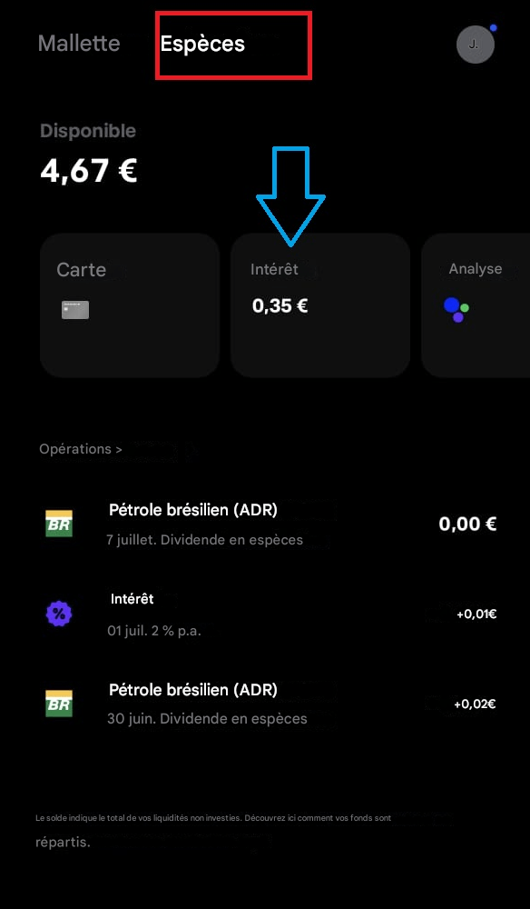 Une fois que vous avez ouvert votre application Trade Republic (et que vous y avez déposé de l'argent), accédez à la section espèces (rectangle rouge) et à partir de là, les derniers mouvements de revenus (intérêts, dividendes, etc.) sont visibles.