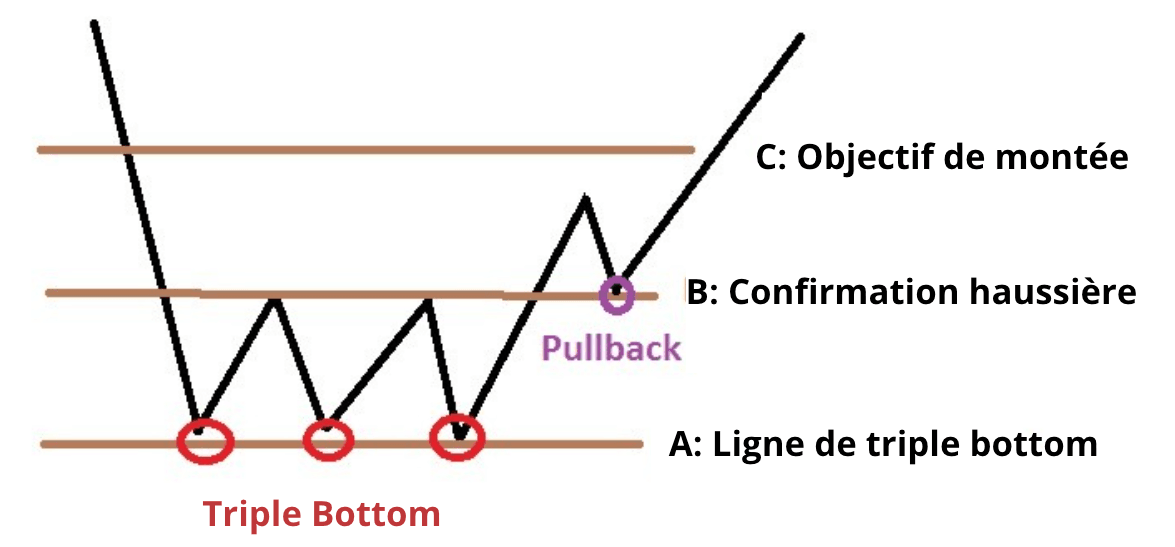 Pour la formation d'un triple bottom, le prix devra casser le niveau de prix correspondant aux sommets situés entre les trois creux, c'est-à-dire la ligne B. Une fois ce niveau cassé, le prix devrait monter d'une distance égale à celle qui sépare les lignes A et B. Il est très important d'attendre la confirmation (cassure de la ligne B) car sinon, il pourrait s'agir d'un drapeau de continuation de tendance baissière.